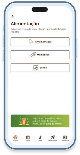 Você registra e acompanha a alimentação do seu bebê, seja por amamentação, mamadeira ou alimentos sólidos.