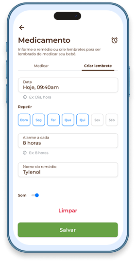 Aqui você registra os medicamentos do seu bebê e cria lembretes personalizados para não esquecer nenhuma dose, garantindo cuidado e atenção nos horários certos.